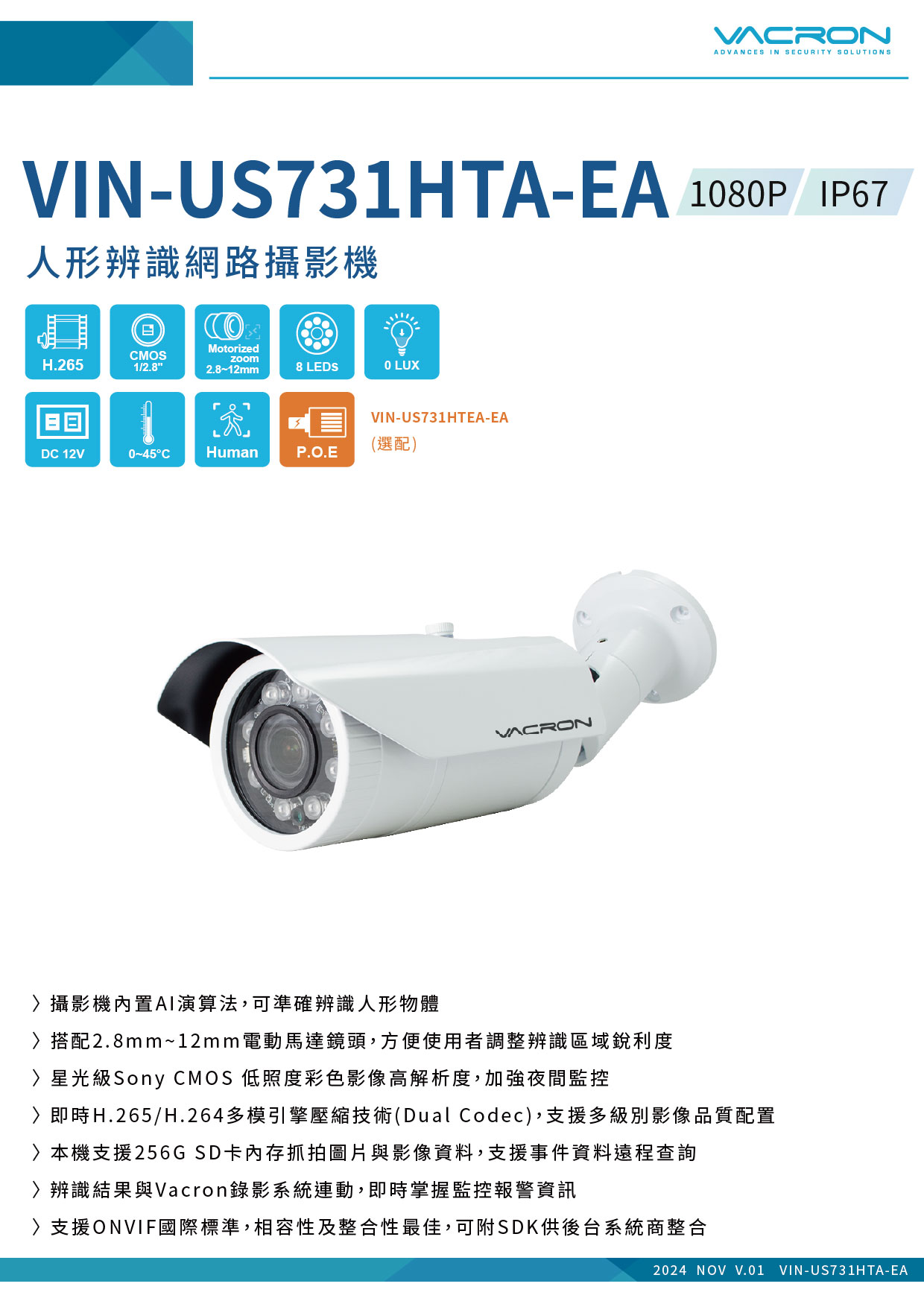 - 支援ONVIF國際標準,相容性及整合性最佳,可附SDK供後台系統商整合