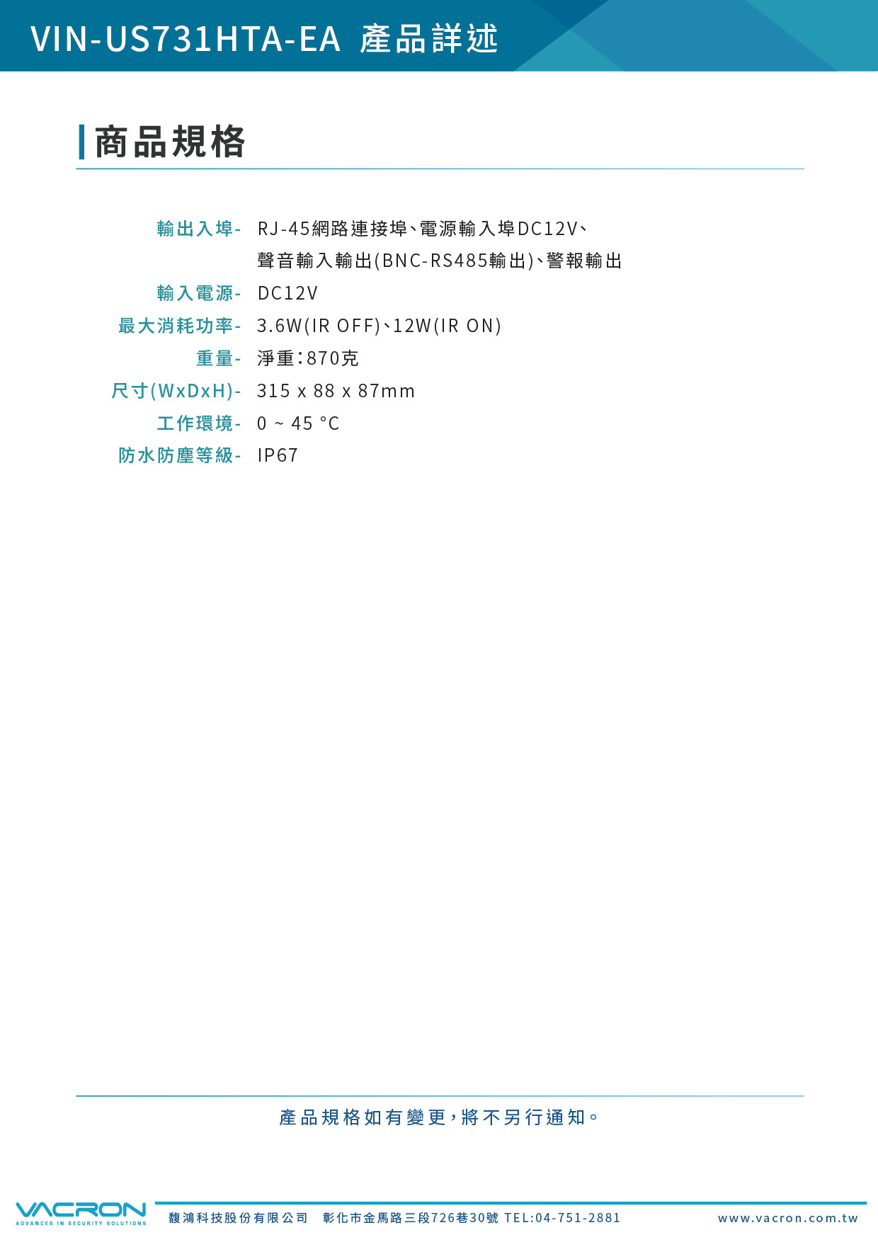 輸出入埠 | RJ-45網路連接埠、電源輸入埠DC12V、聲音輸入輸出(BNC-RS485輸出)、警報輸出 | |||