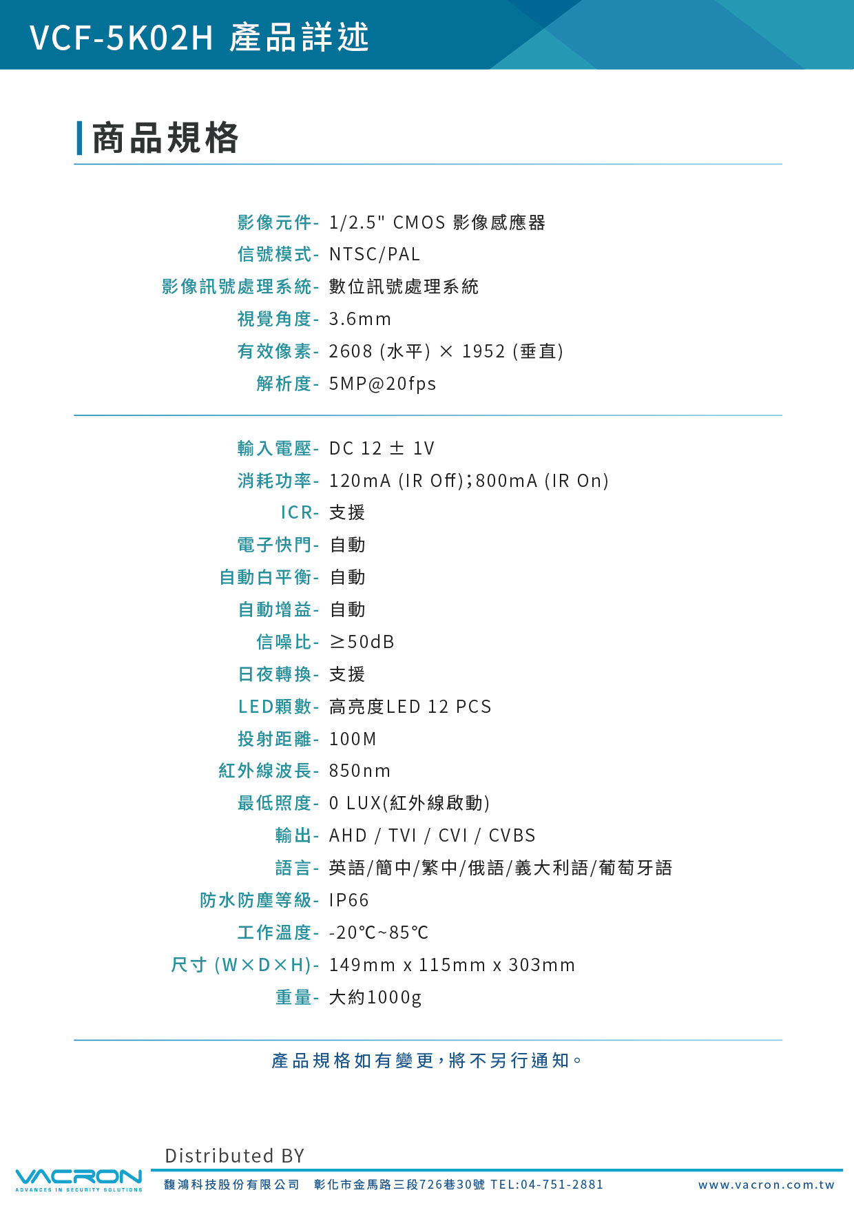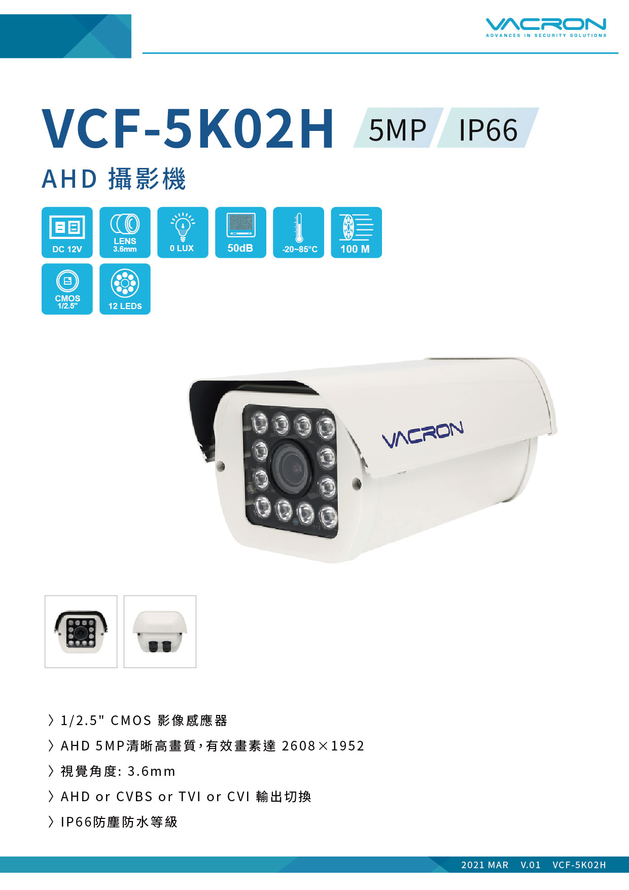 - AHD 5MP 清晰高畫質,有效畫素達 2608 × 1952