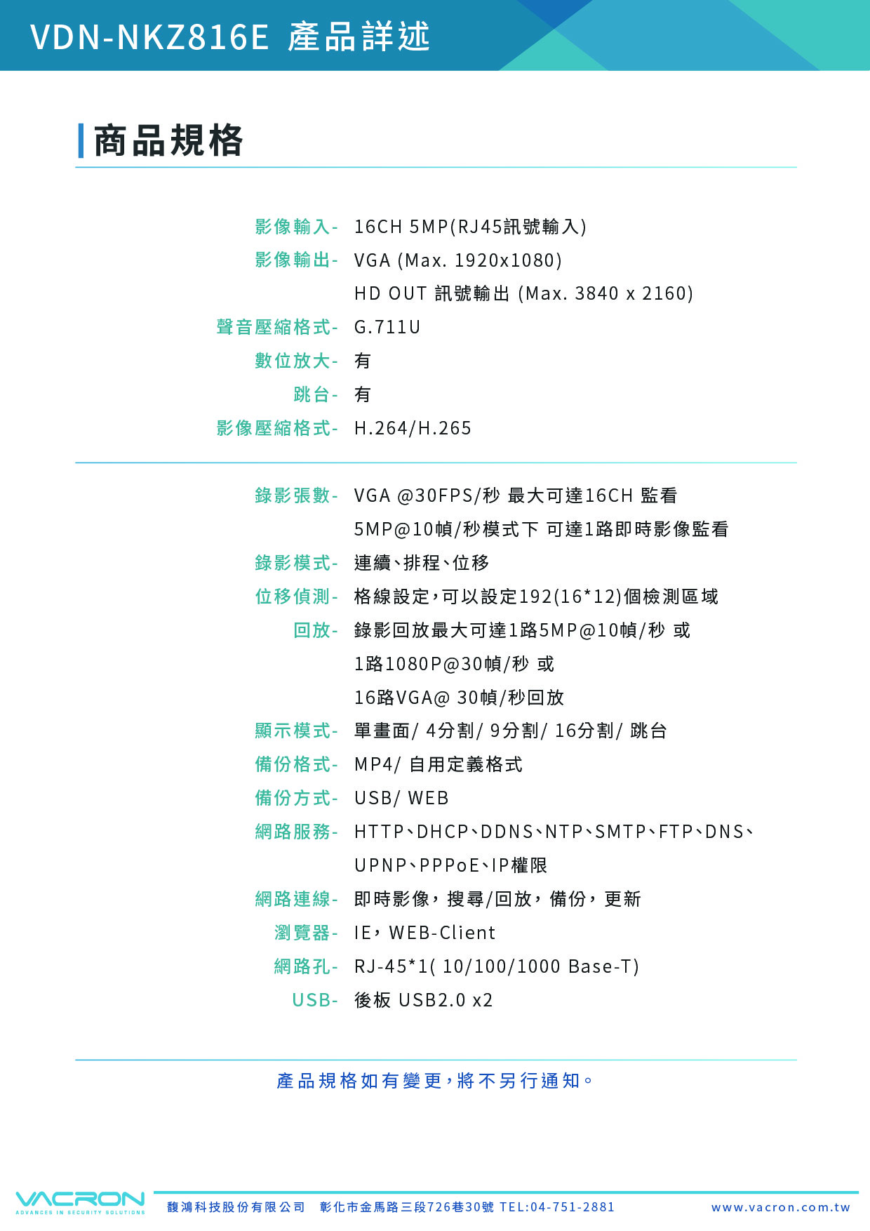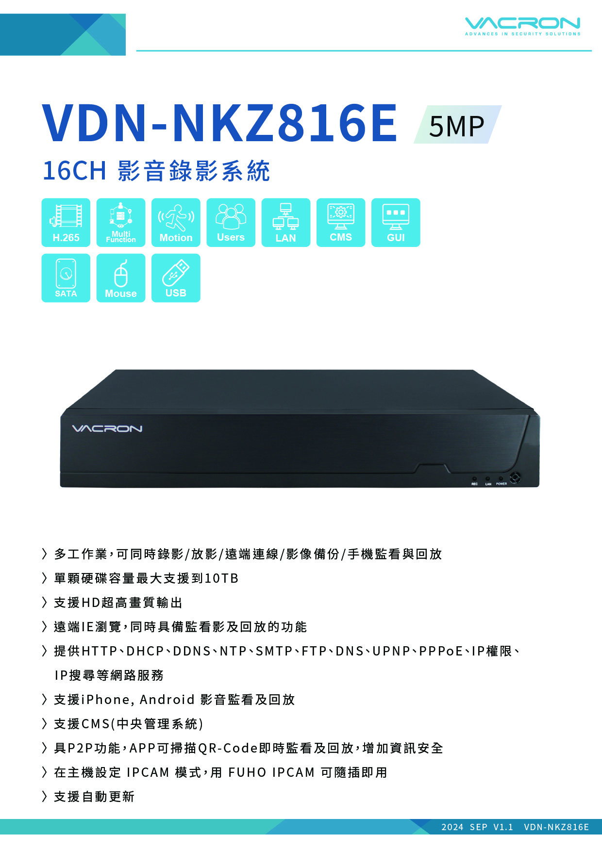 錄影張數 | VGA @30FPS/秒最大可達16CH 監看 5MP@10幀/秒模式下可達1路即時影像監看 |