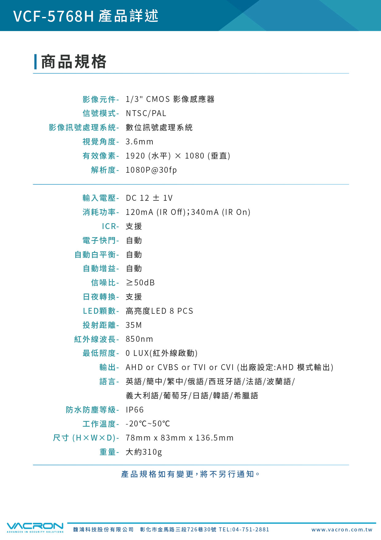 - AHD 1080 p 畫質,有效畫素達 1920 x 1080