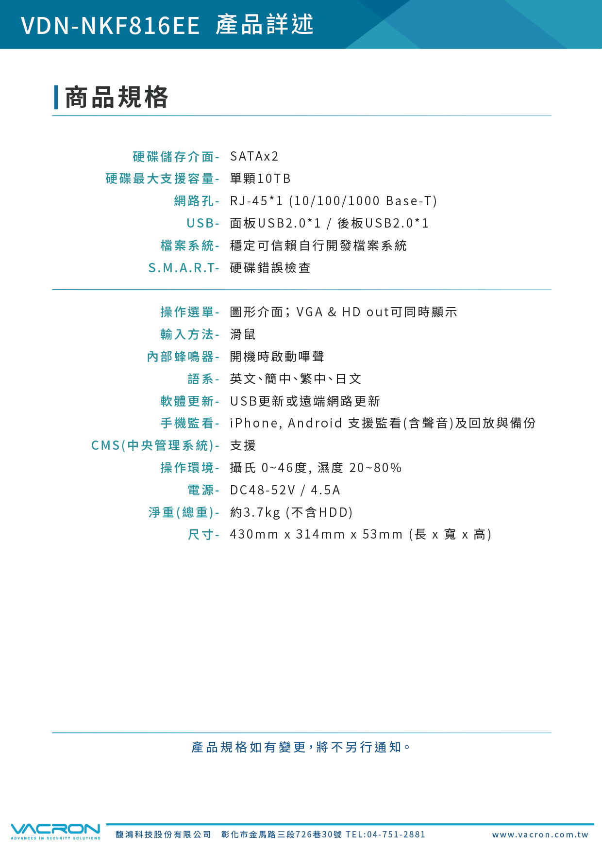 操作環境 | 攝氏0~46度、濕度20~80% | |||
