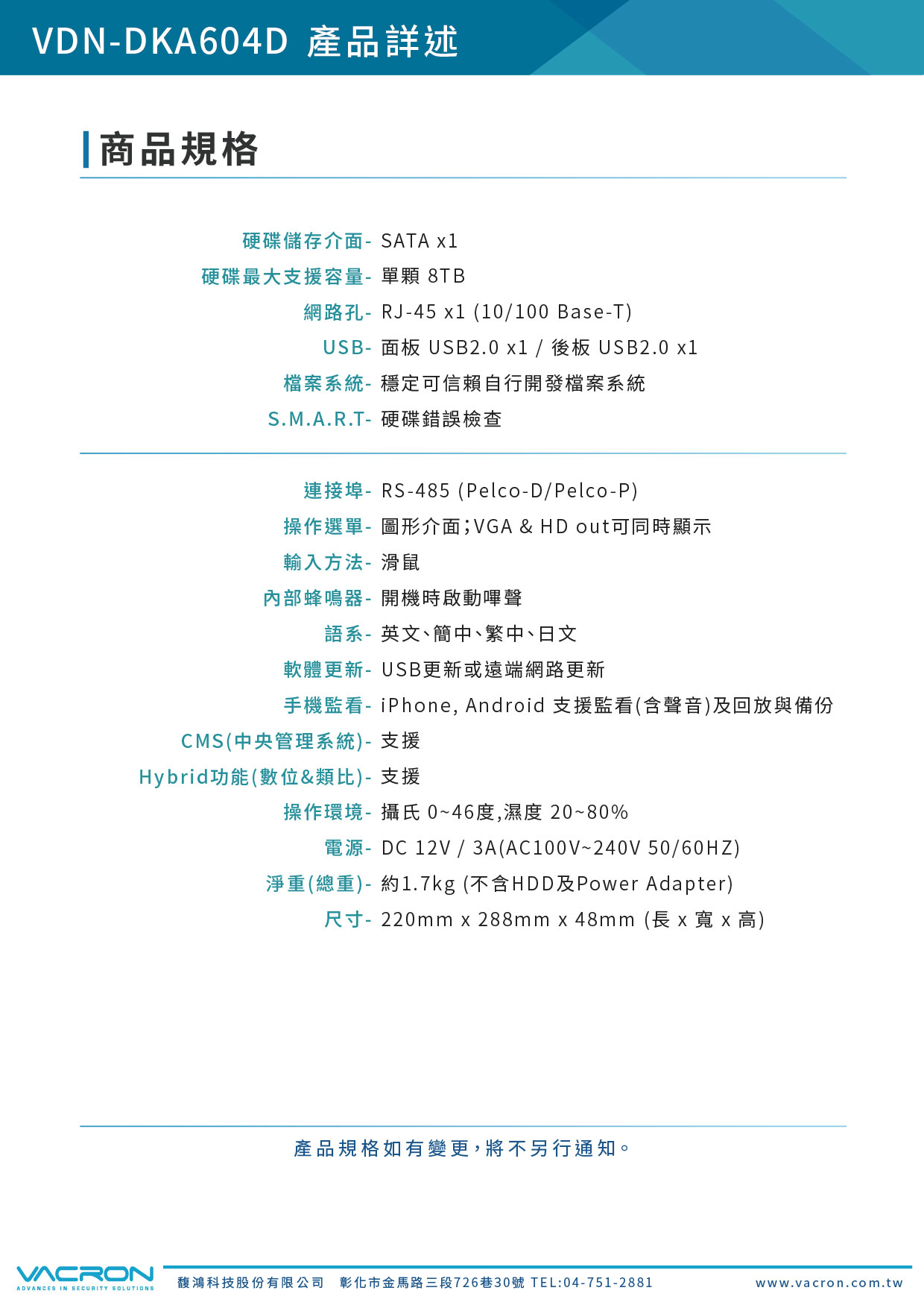 淨重(總重) | 約1.7kg (不含HDD及Power Adapter) | |||