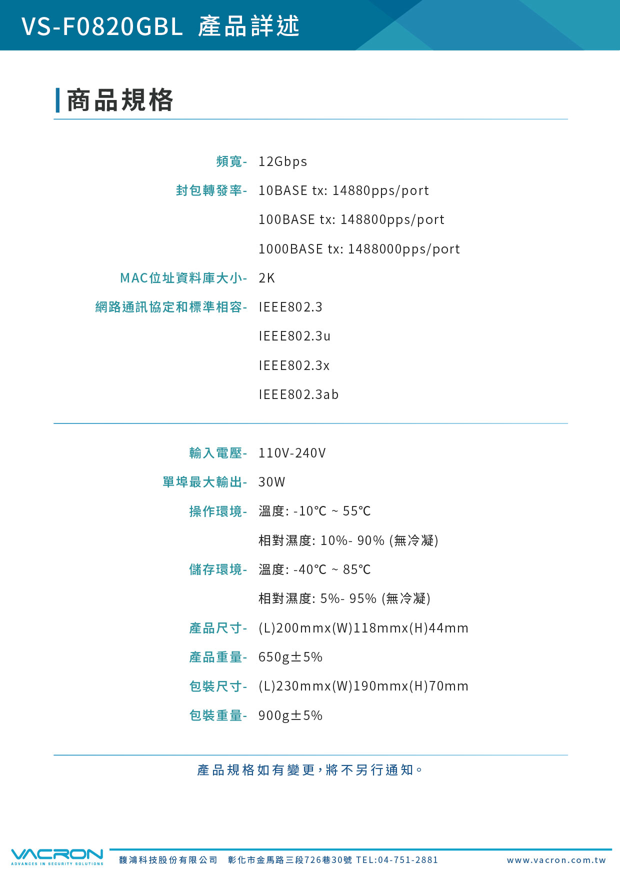 產品規格如有變更,恕不另行通知