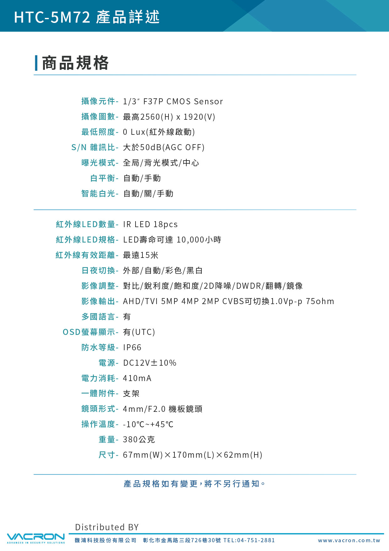 影像輸出 | AHD/TVI 5MP 4MP 2MP CVBS可切換1.0Vp-p 75ohm | |||