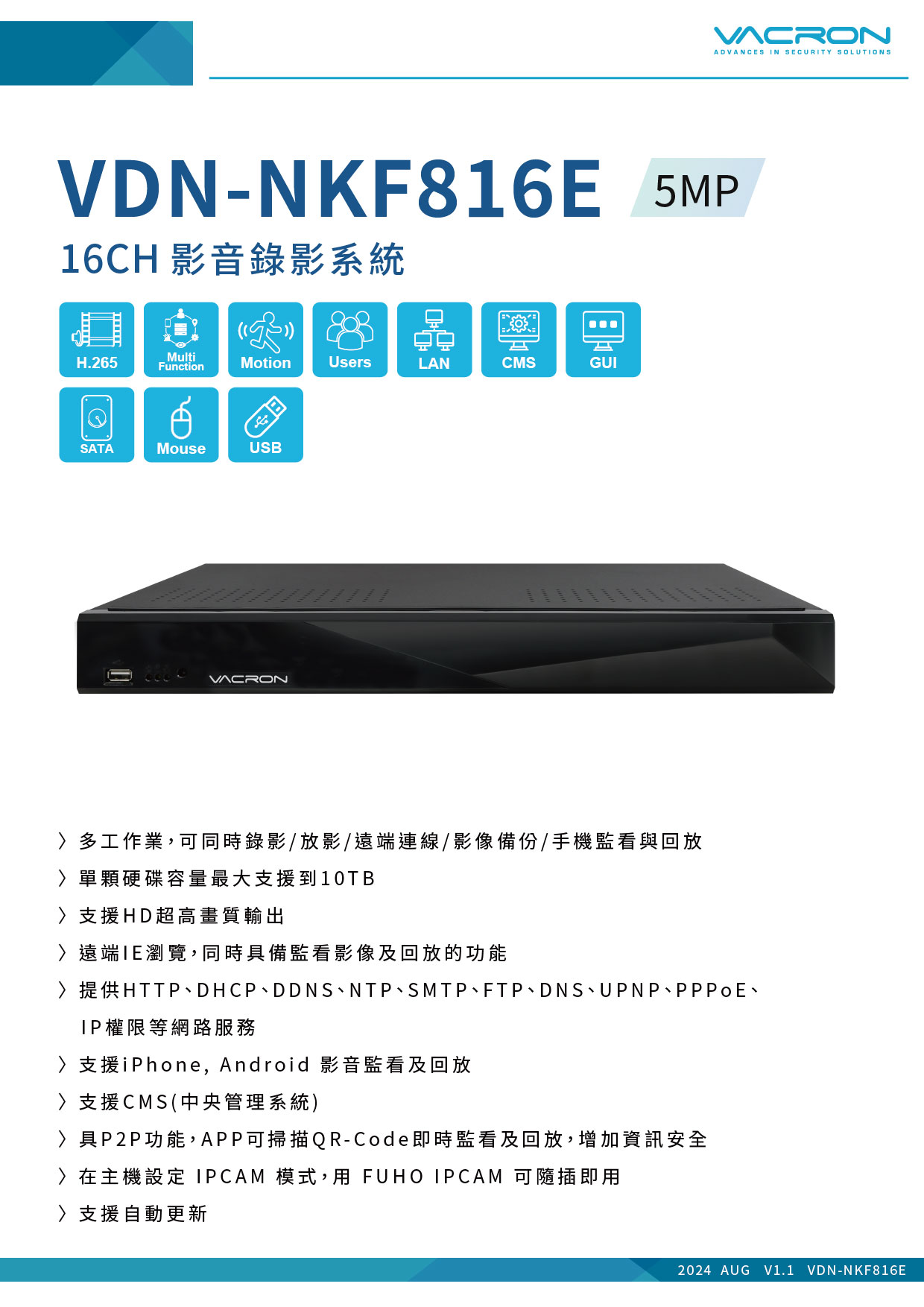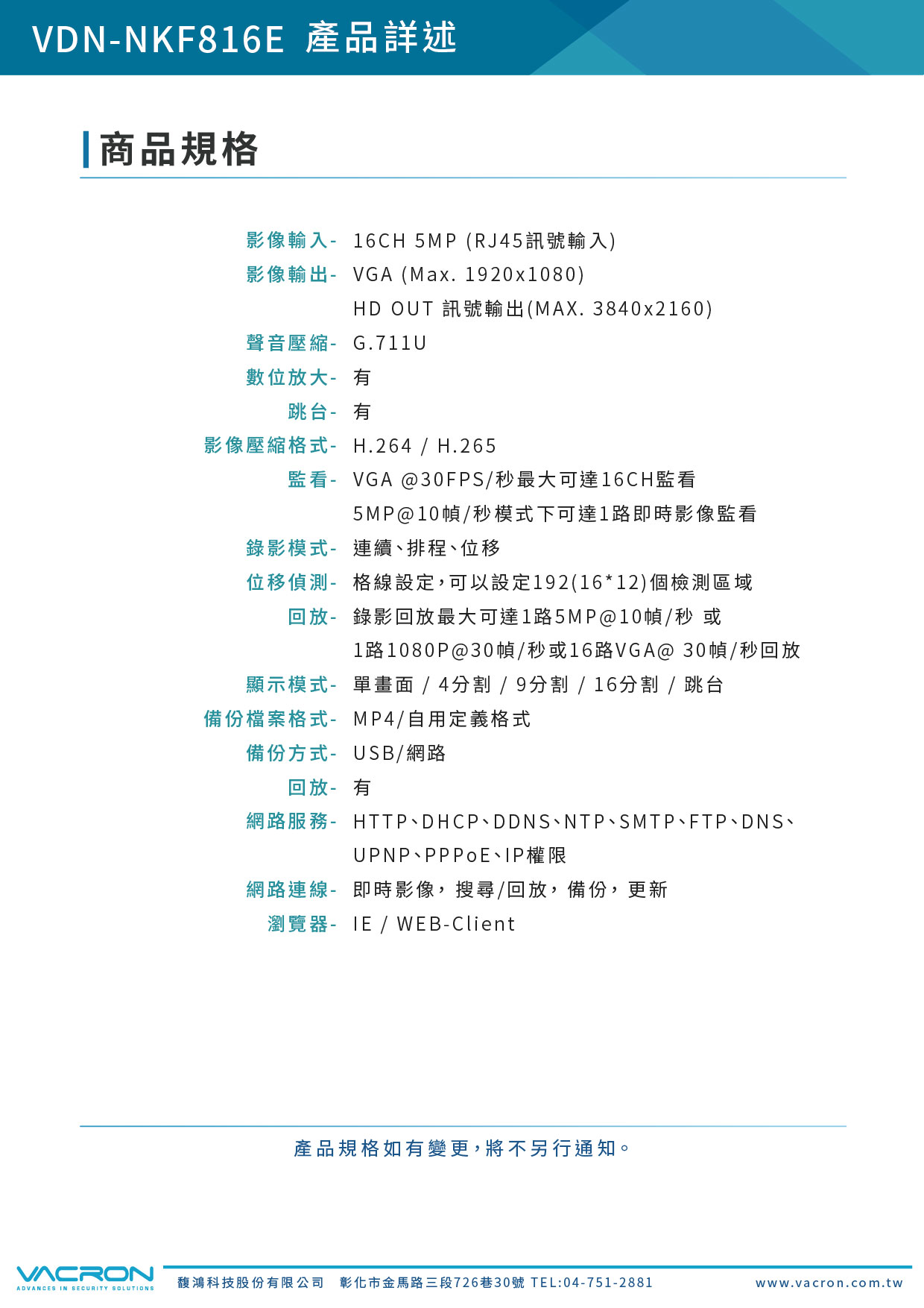錄影監看 | VGA @30FP S/秒最大可達16CH監看 5MP@10幀/秒模式下可達1路即時影像監看 |