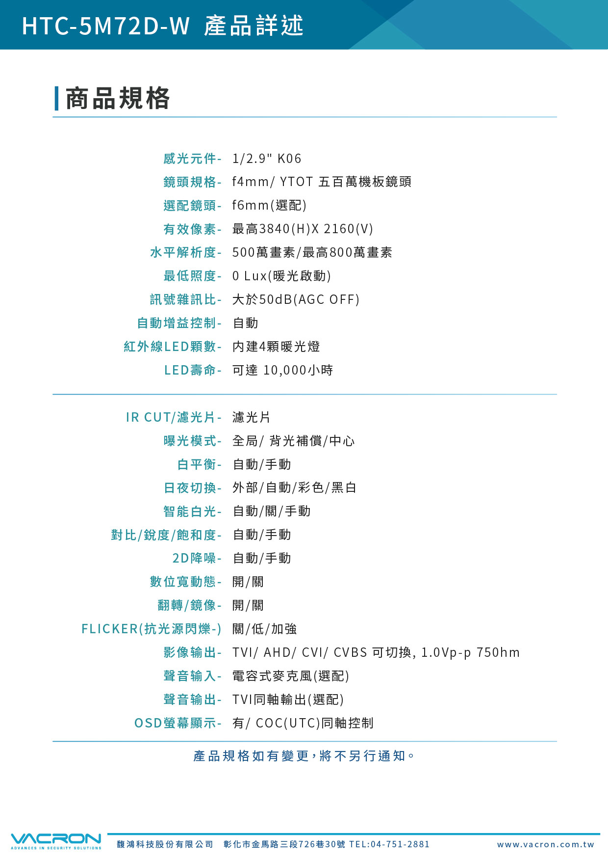 鏡頭規格 | f4mm/ YTOT 五百萬機板鏡頭 | |||