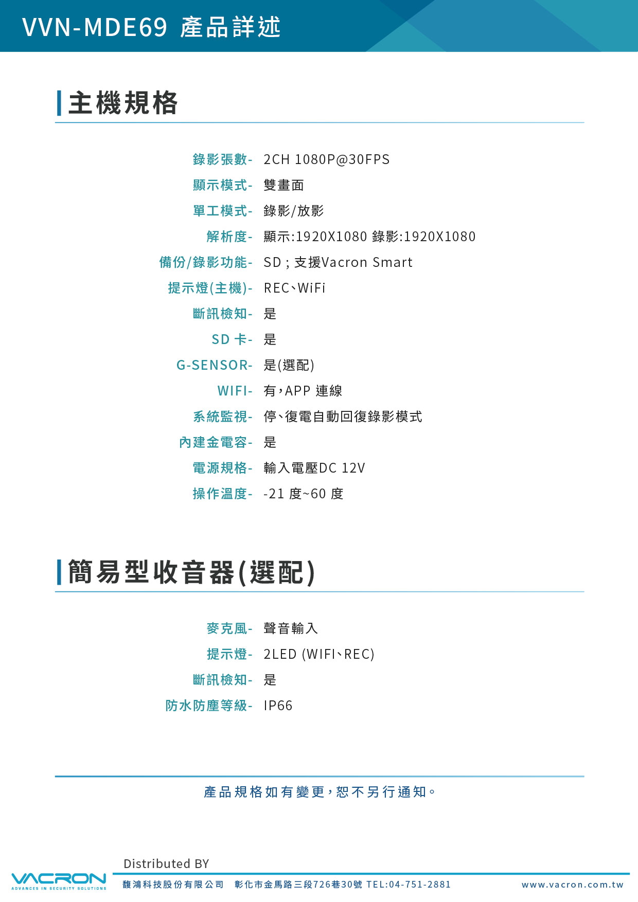 備份/錄影功能 | SD ; 支援Vacron Smart | |||