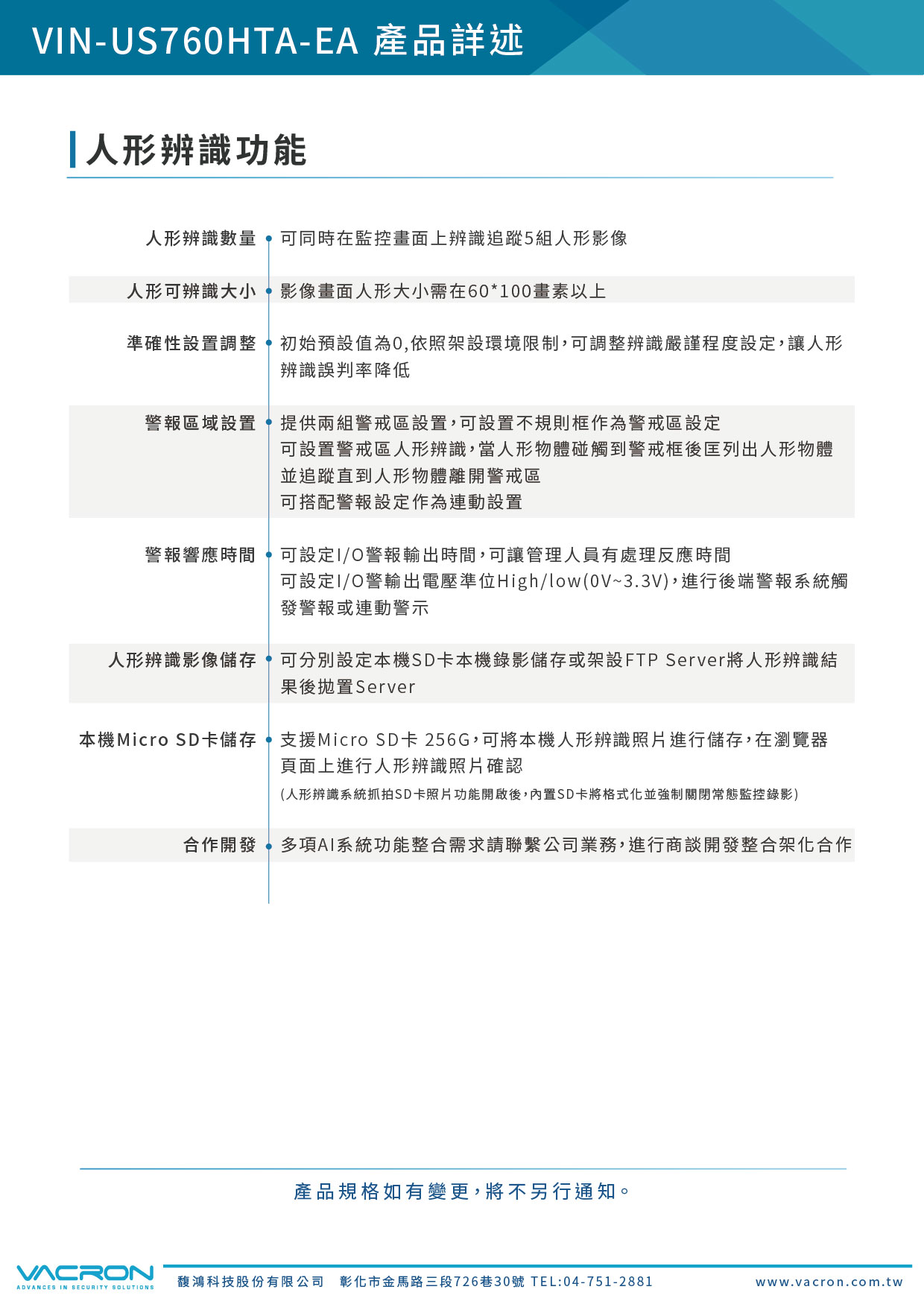 - 攝影機內置AI演算法,可準確辨識人形物體