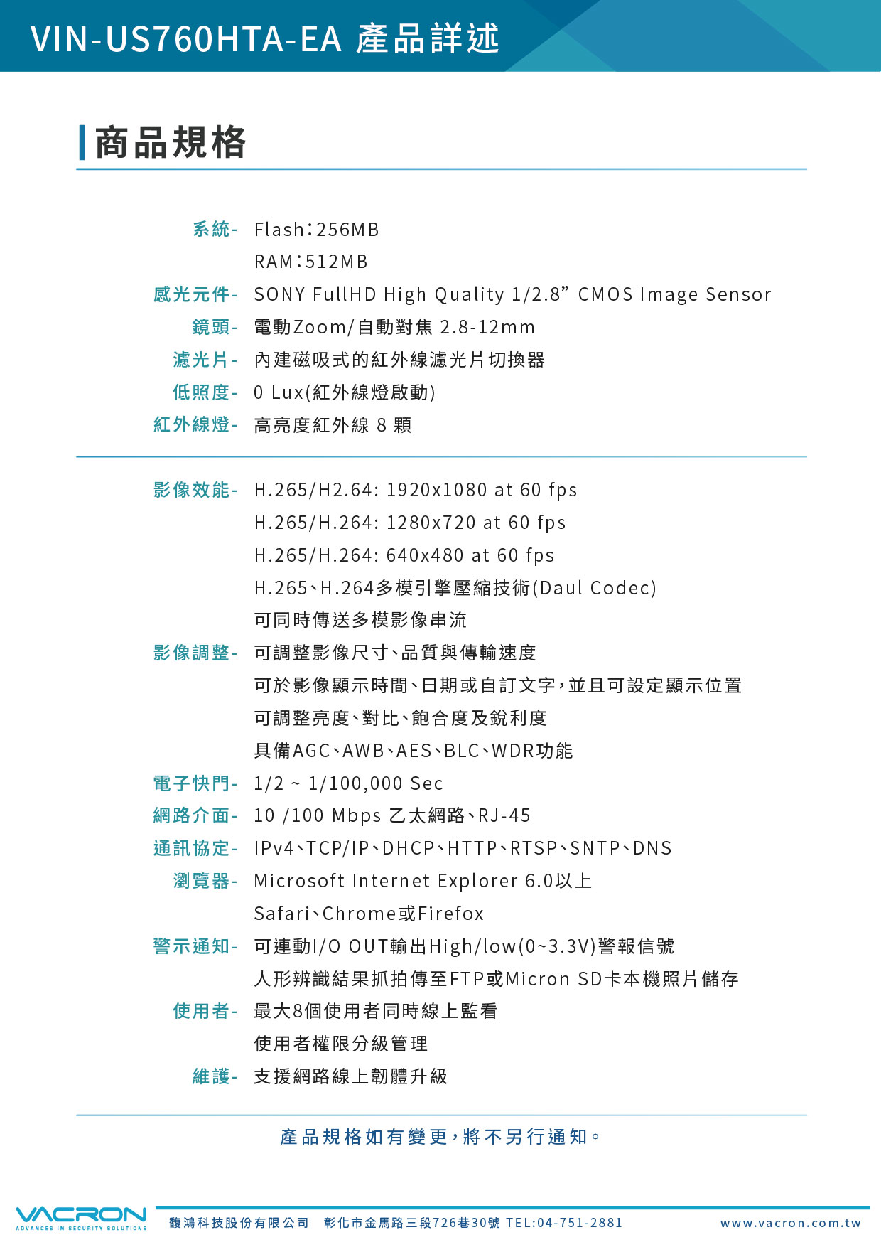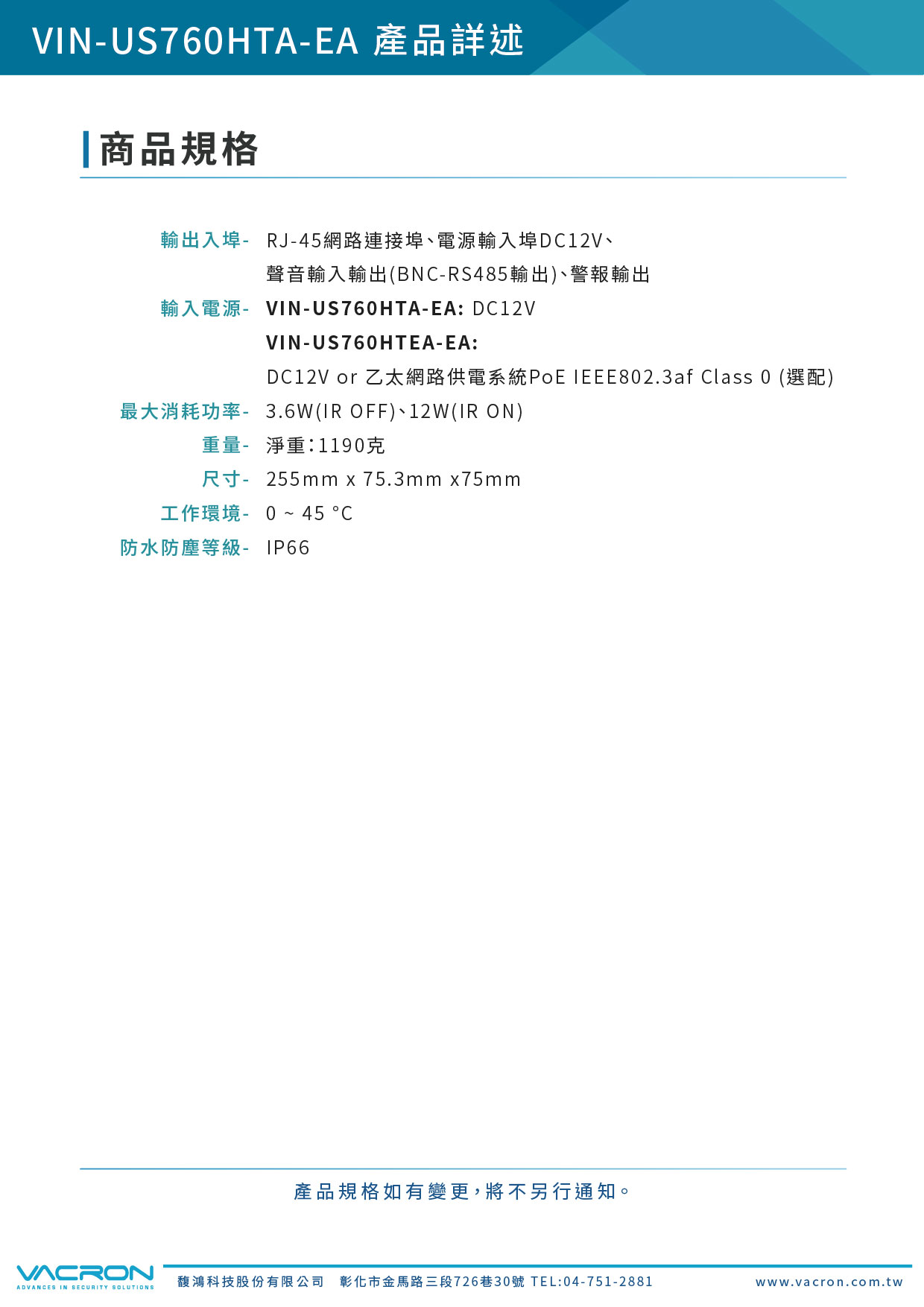 VIN-US760HTEA-EA: DC12V or 乙太網路供電系統PoE IEEE802.3af Class 0 (選配) | ||||