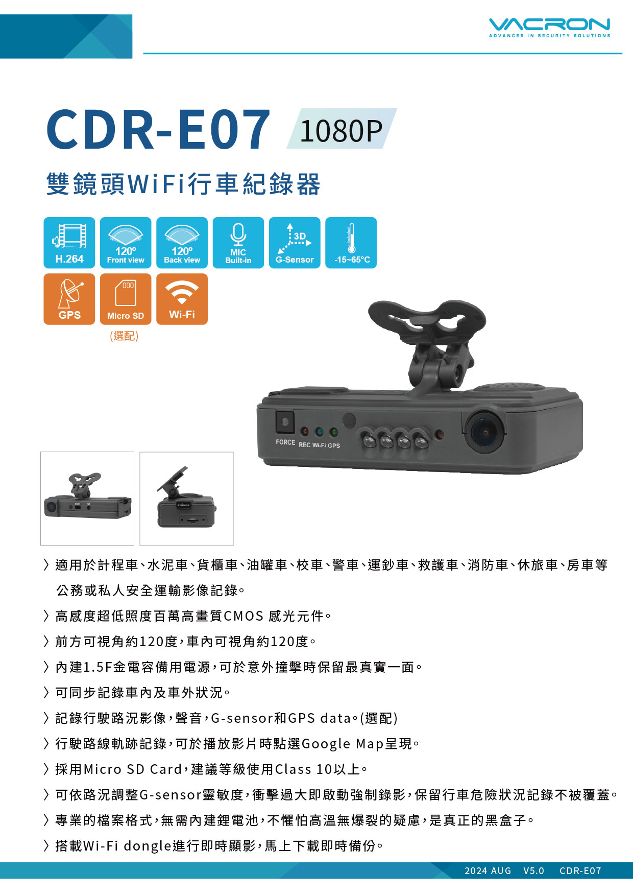 - 適用於計程車、水泥車、貨櫃車、油罐車、校車、警車、運鈔車、 救護車、消防車、休旅車、房車等公務或私人安全運輸影像記錄。