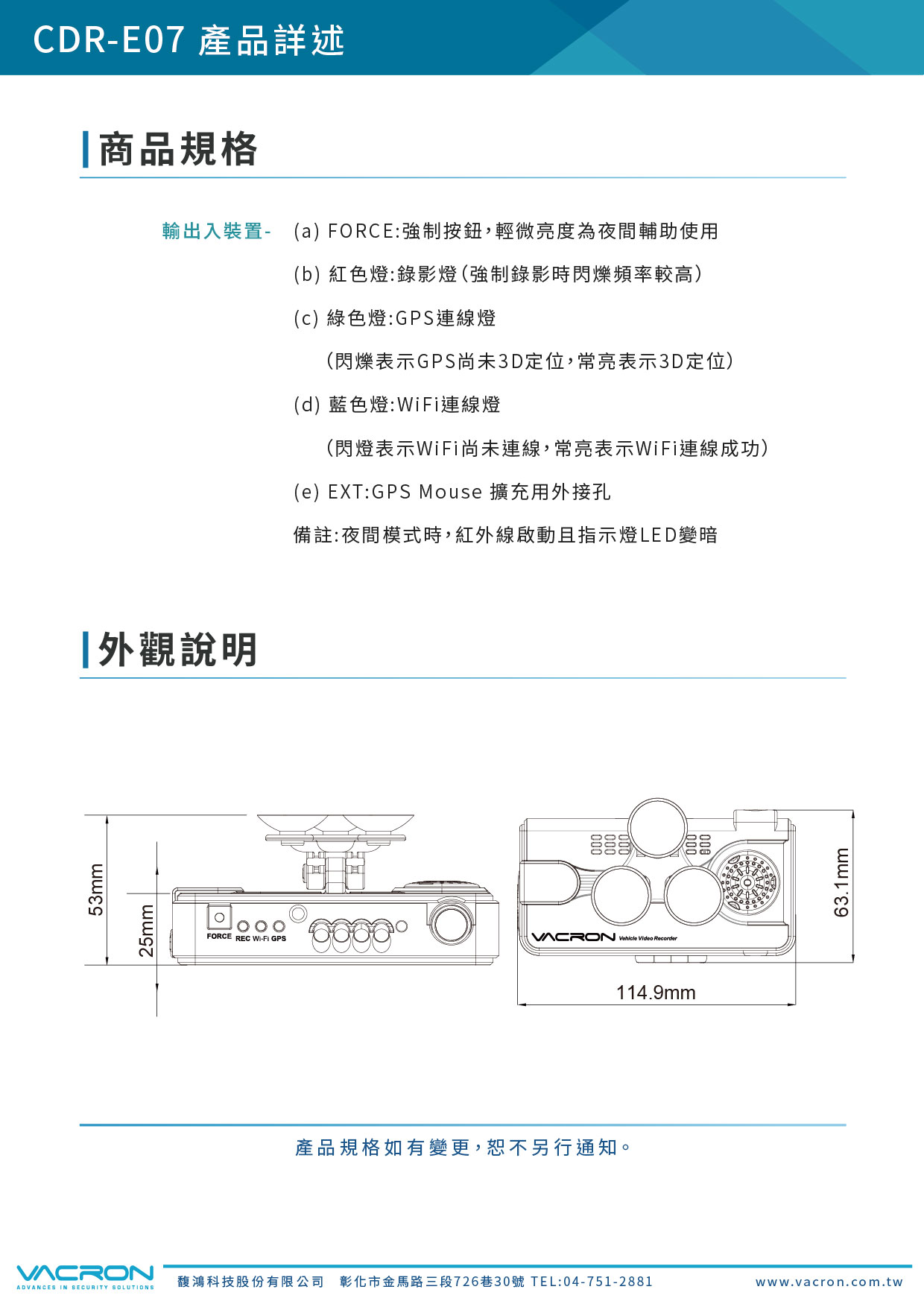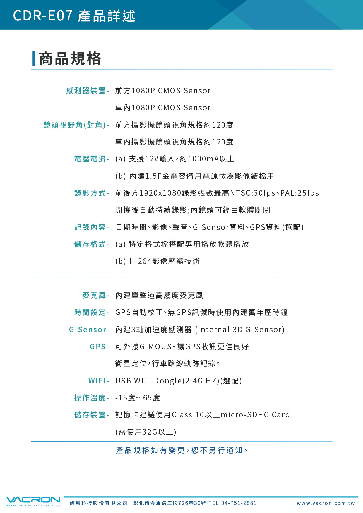 記錄內容 | 日期時間、影像、聲音、G-Sensor資料、GPS資料(選配) | |||